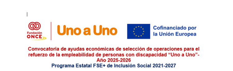 Este curso está cofinanciado por el Fondo Social Europeo Plus (FSE+) y la Fundación ONCE, y se enmarca dentro de la Convocatoria de ayudas económicas para el refuerzo de la empleabilidad de personas con discapacidad “Uno a Uno” (2025-2026), integrada en el Programa Estatal FSE+ de Inclusión Social 2021-2027.